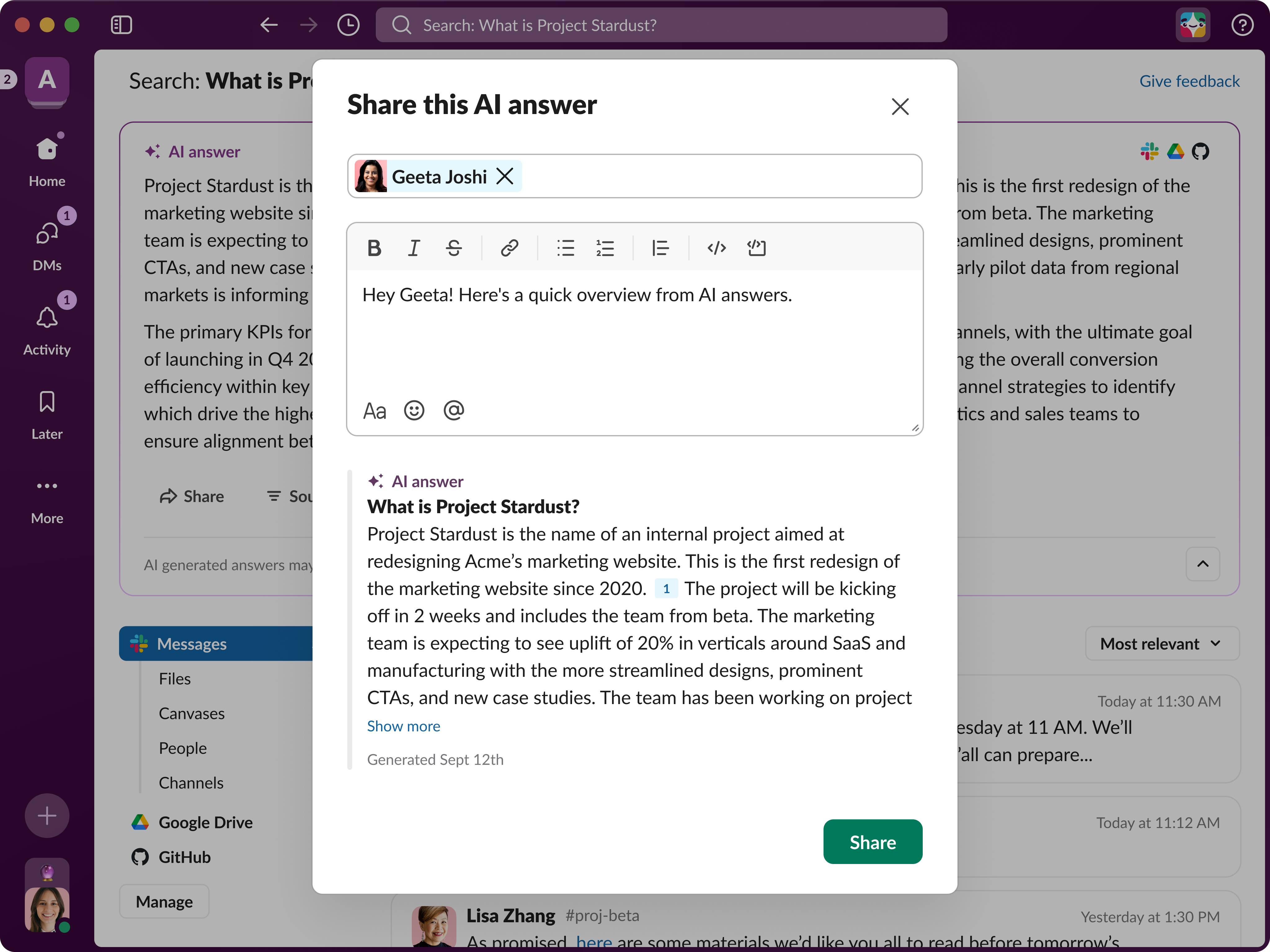 Permite compartir al instante respuestas generadas por IA en canales o mensajes directos con un solo clic, sin necesidad de capturas de pantalla ni de copiar y pegar. Las respuestas compartidas se convierten en mensajes permanentes en Slack que conservan todo su contexto, lo que facilita consultarlas, responderlas o reutilizarlas en preguntas recurrentes como procesos de incorporación, políticas o flujos de trabajo del equipo.***