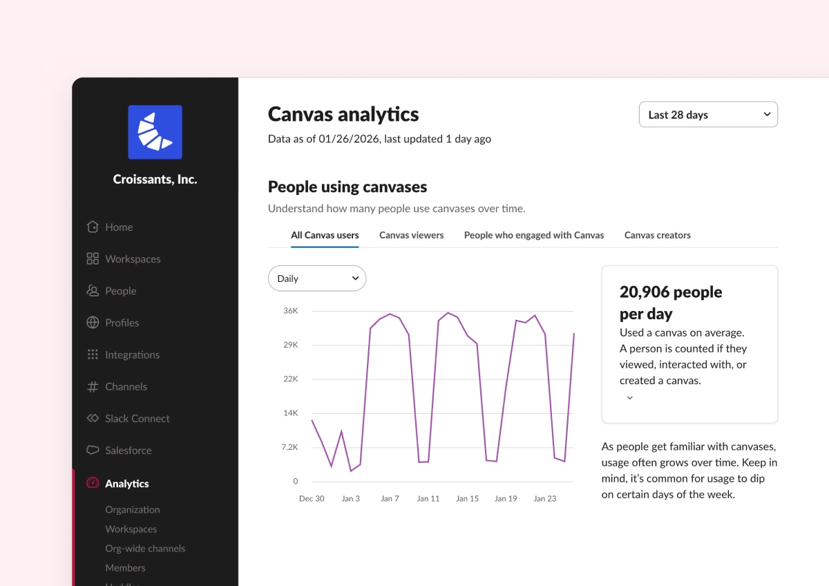 올겨울 업데이트 작업은 실제 업무의 어려움을 해소하는 데 중점을 두었습니다. 보다 직관적인 워크플로와 자동화 기능부터 한층 풍부해진 캔버스 협업, 분석 성능과 접근성, 그리고 더욱 강화된 Salesforce와의 연결 성능까지, 다양한 기능을 통해 팀이 업무 관리에 소요되는 시간을 줄이고 업무 진척에 더 많은 시간을 할애할 수 있도록 지원합니다. 업그레이드된 Slackbot은 맥락 기반 인텔리전스가 강화되었으며, 내장된 AI 가드레일을 통해 보안과 신뢰를 최우선으로 생각합니다.