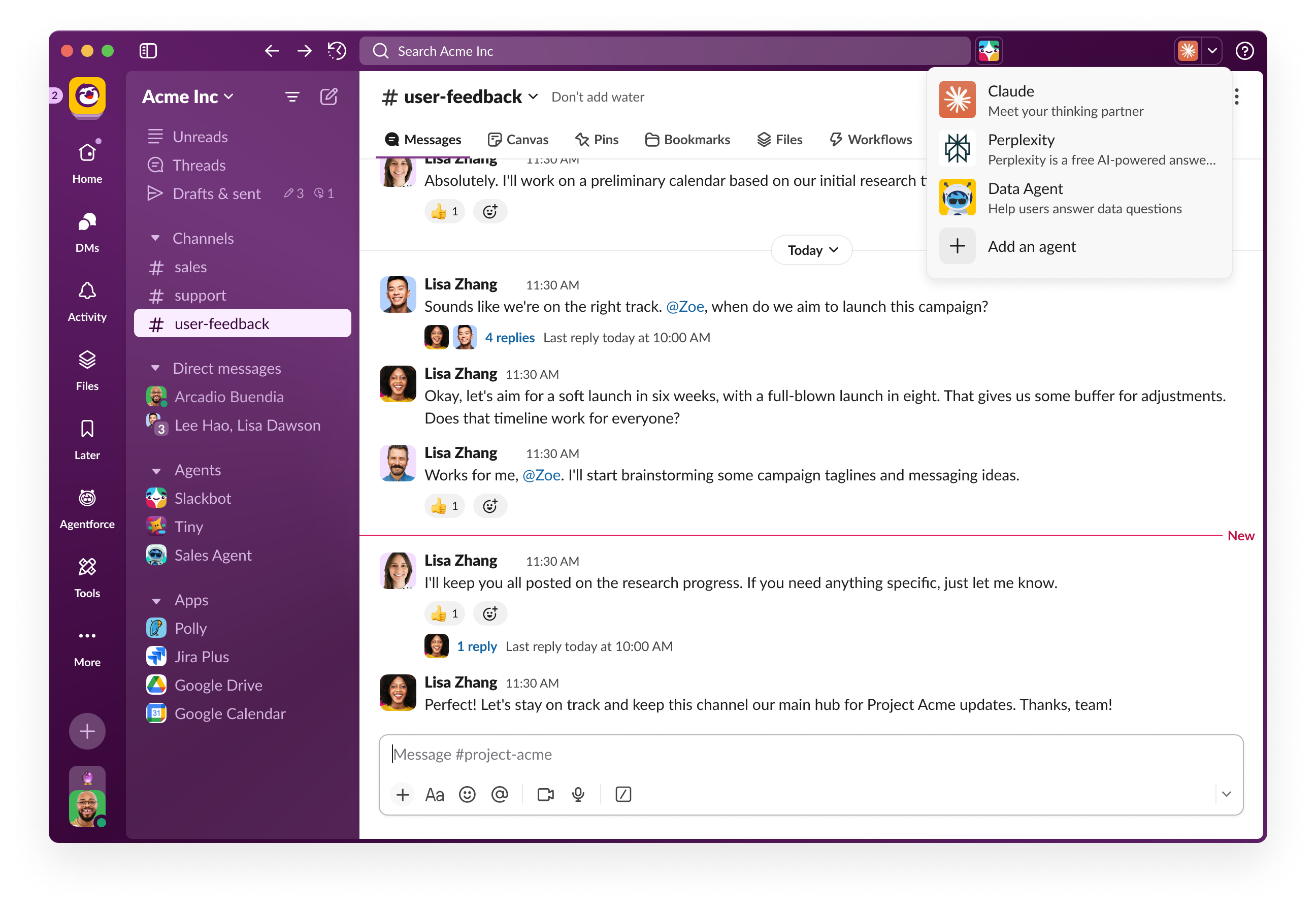 Slackbot이 다음에 해야 할 일을 결정하는 데 도움을 주고, Slack이 그 이후의 모든 과정을 처리합니다. 필요한 작업을 지시하면 Slack이 그 지시를 에이전트, 워크플로, 문서, 그리고 이미 사용자 업무를 지원하는 시스템 전반에 걸쳐 행동으로 옮깁니다. 에이전트는 한결 수월하게 검색, 관리할 수 있고, 워크플로는 대화의 자연스러운 흐름에서 자동으로 실행되며, 설정 작업은 백그라운드에서 처리됩니다. 이번 업데이트는 보다 선명한 시각화 정보, 풍부한 미리보기, 항상 맥락에 맞는 실시간 Salesforce 데이터를 사용해 모든 단계에서 마찰을 줄임으로써 클릭 횟수와 설정 단계를 줄이고 “나중에 해야지.”라고 생각하는 순간을 크게 줄여 업무가 원활히 진행되도록 설계되었습니다.