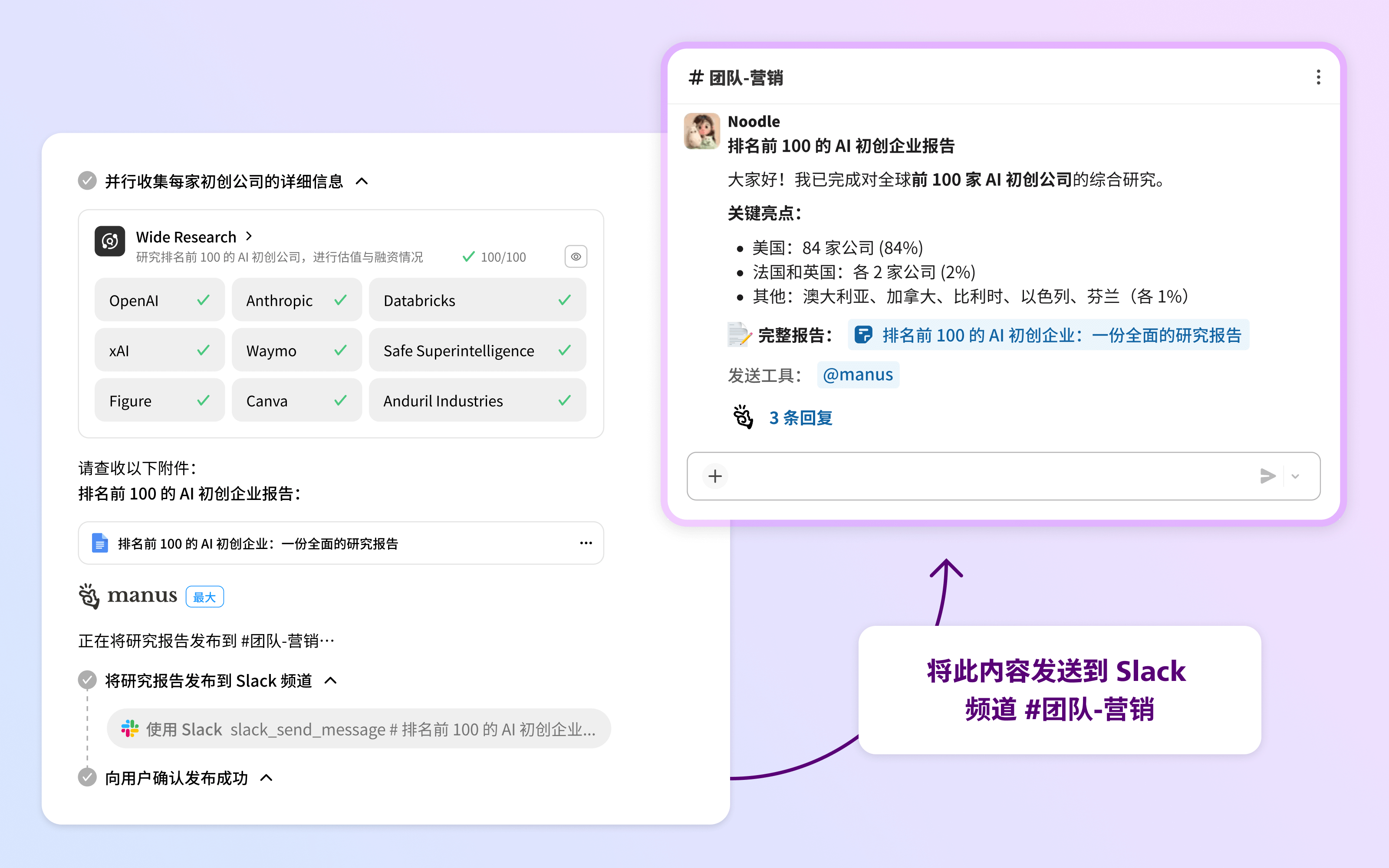 - Manus:自主式通用 AI 代理,旨在完成任务并交付成果。借助 Manus 上的 Slack Connector,它能读取你的频道、提取关键见解、将讨论内容转化为行动项目,并向团队反馈结果——所有这些都可以通过简单的自然语言指令完成,如同拥有一位对团队了如指掌的私人助理。
